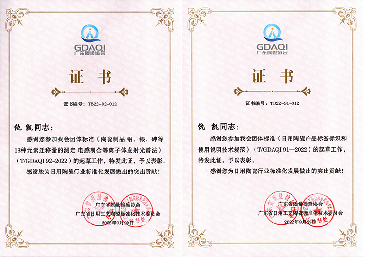 日前,由濟南迪科瑞儀器參與起草的《陶瓷制品 鋁、銀、砷等18種元素遷移量的測定電感耦合等離子體發射光譜法》、《日用陶瓷產品標簽標識和使用說明技術規范》兩項團體標準經廣東省質量檢驗協會發布,于2022年10月1日正式實施。